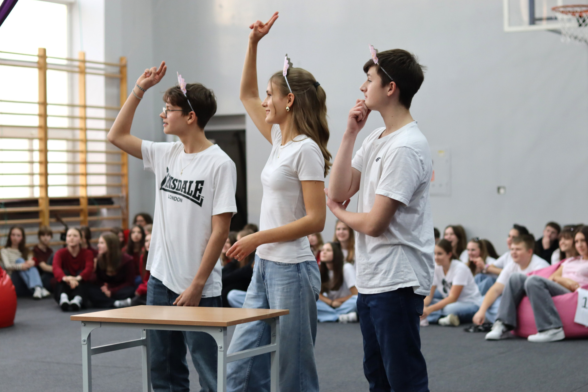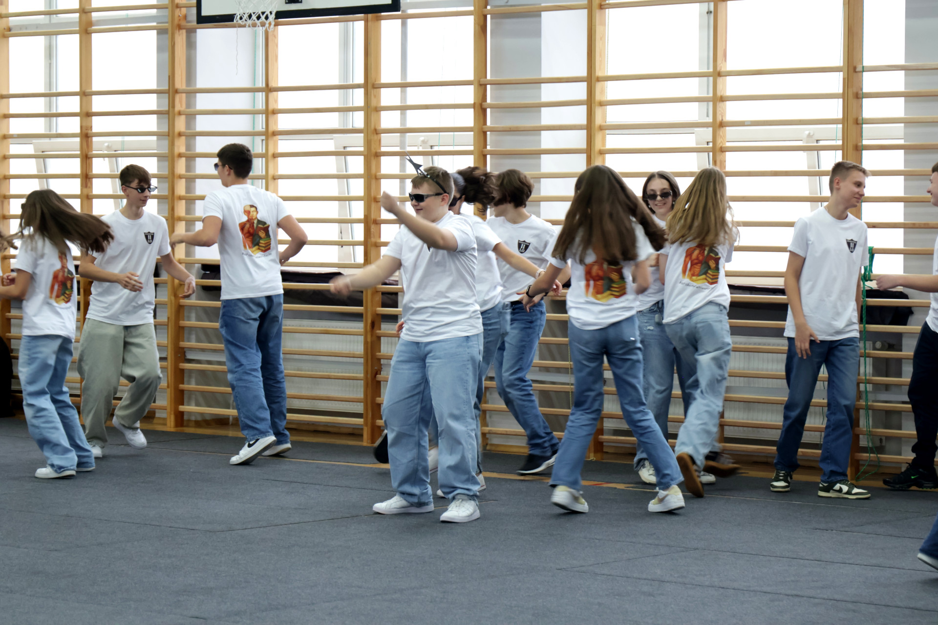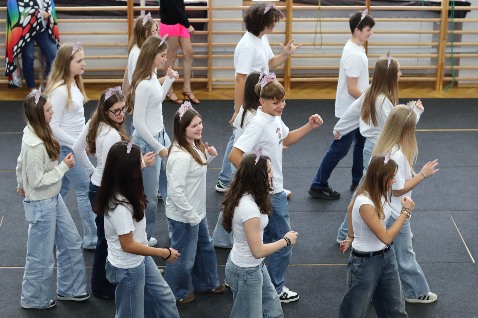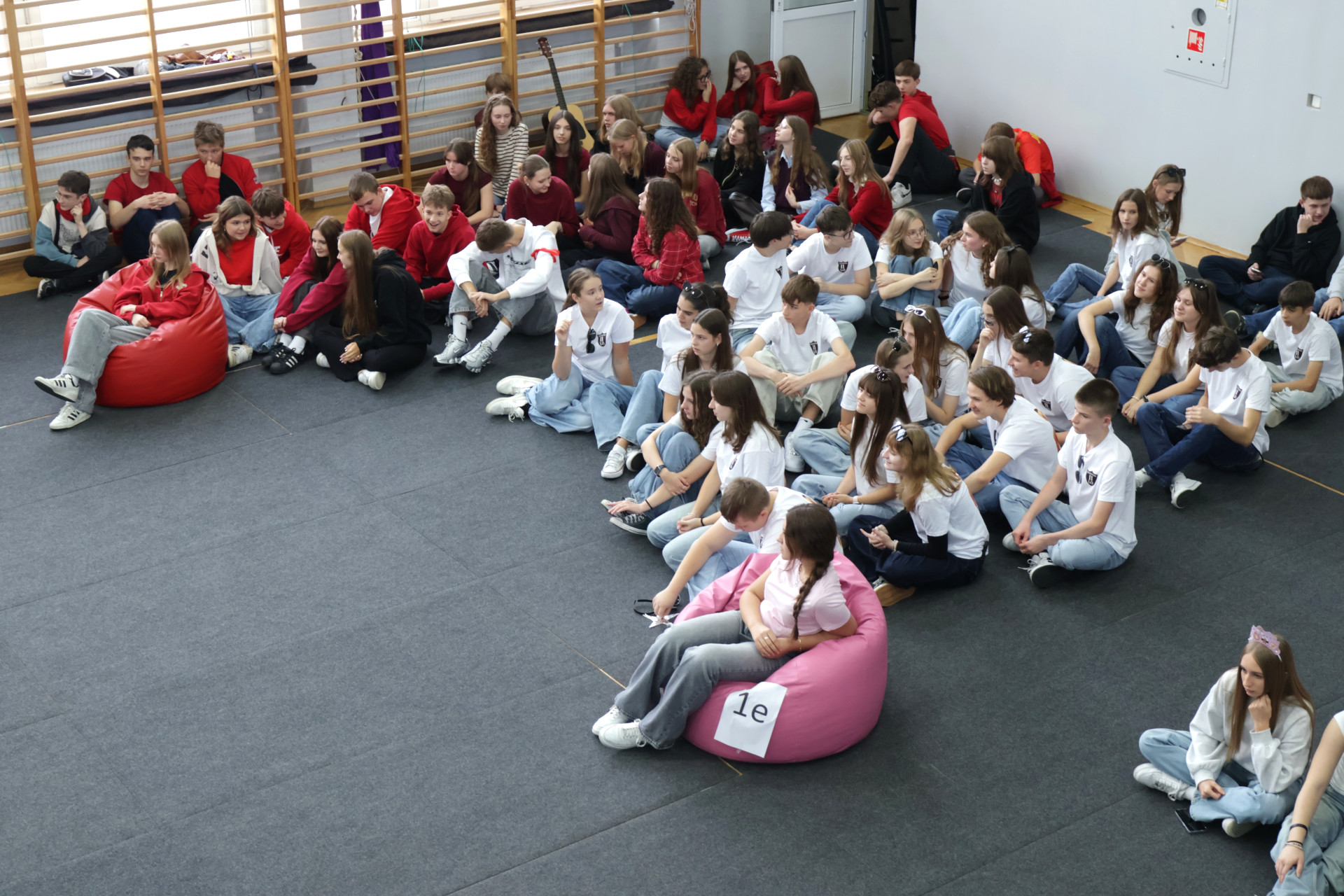 Impreza rozpoczęła się od prezentacji każdej z pierwszych klas – uczniowie wykazali się pomysłowością, kreatywnością i poczuciem humoru, przedstawiając swoje klasy w oryginalny sposób. Następnie przyszedł czas na różnorodne konkurencje: zwinnościowe, muzyczne oraz sprawdzające wiedzę ogólną. Wszystkie klasy dały z siebie wszystko, a atmosfera zdrowej rywalizacji udzieliła się zarówno uczestnikom, jak i wychowawcom. Na zakończenie wszyscy uczniowie wspólnie zatańczyli belgijkę, co było doskonałym zwieńczeniem całej imprezy i symbolem integracji między klasami.