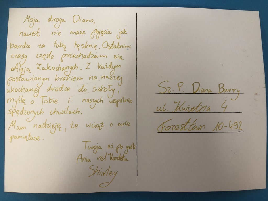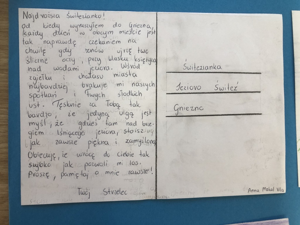 Zadaniem uczniów było wybranie bohatera literackiego i stworzenie autorskiej pocztówki: z jednej strony ilustracji lub kolażu oddającego klimat książki, z drugiej – krótkiej wiadomości napisanej z perspektywy wybranej postaci i zaadresowanej do dowolnego odbiorcy. Prace zachwycały różnorodnością form, pomysłowością i dojrzałością interpretacyjną. Bohaterowie znanych lektur „ożywali” w słowach uczniów, mówiąc własnym głosem, często zaskakująco trafnym i poruszającym.