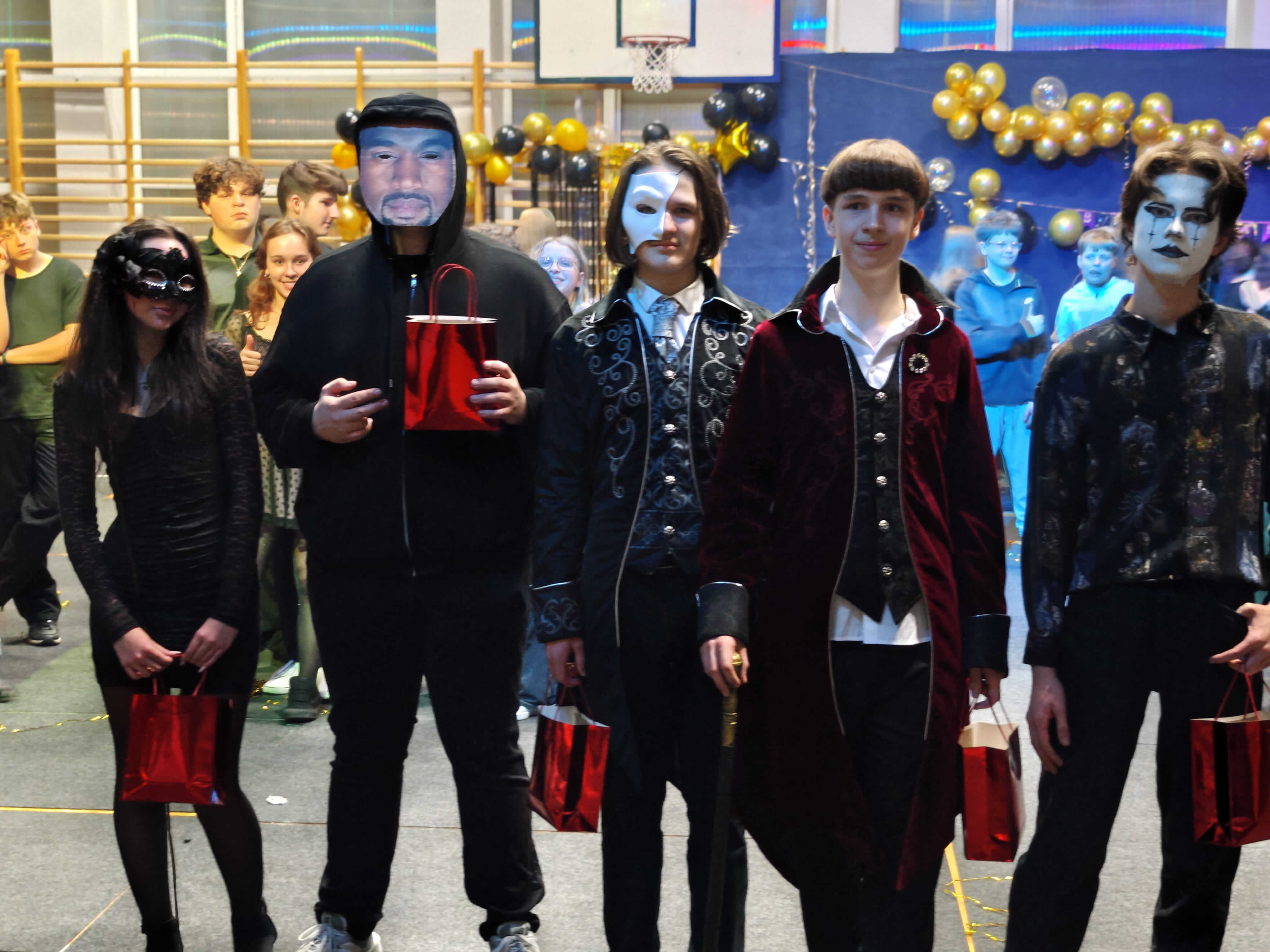 Uczniowie zachwycili pomysłowością swoich przebrań. Wśród masek i kostiumów pojawiły się zarówno klasyczne, eleganckie kreacje inspirowane balami weneckimi, jak i tradycyjne stroje karnawałowe, pełne koloru i artystycznego wyrazu. Każdy strój był świadectwem zaangażowania, wyobraźni oraz odwagi w wyrażaniu siebie. Najpiękniejsze stroje zostały nagrodzone specjalnym upominkiem od Pana Dyrektora. Nagrodzeni uczniowie ze szkoły podstawowej to: Maria Borisova 7a, Anastazja Leśniewska 7b, Hanna Rutkowska 7c, Helena Urban 8b, Alisa Reutskaya 8c. Spośród uczniów liceum zostali dostrzeżeni: Antonina Karpiuk 1b, Piotr Bielawski 1c, Wladyslaw Dronzek 1c, Mikhail Tsiarentsyev 1c, Michał Siedacz 1e.