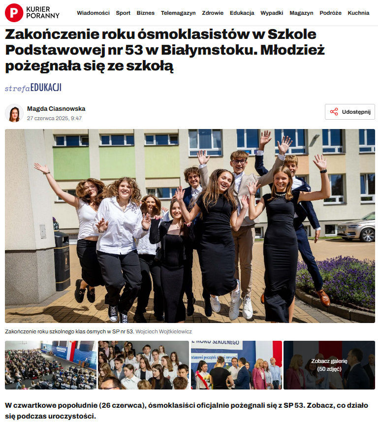 Zakończenie roku ósmoklasistów w Szkole Podstawowej nr 53 w Białymstoku. Młodzież pożegnała się ze szkołą | Kurier Poranny