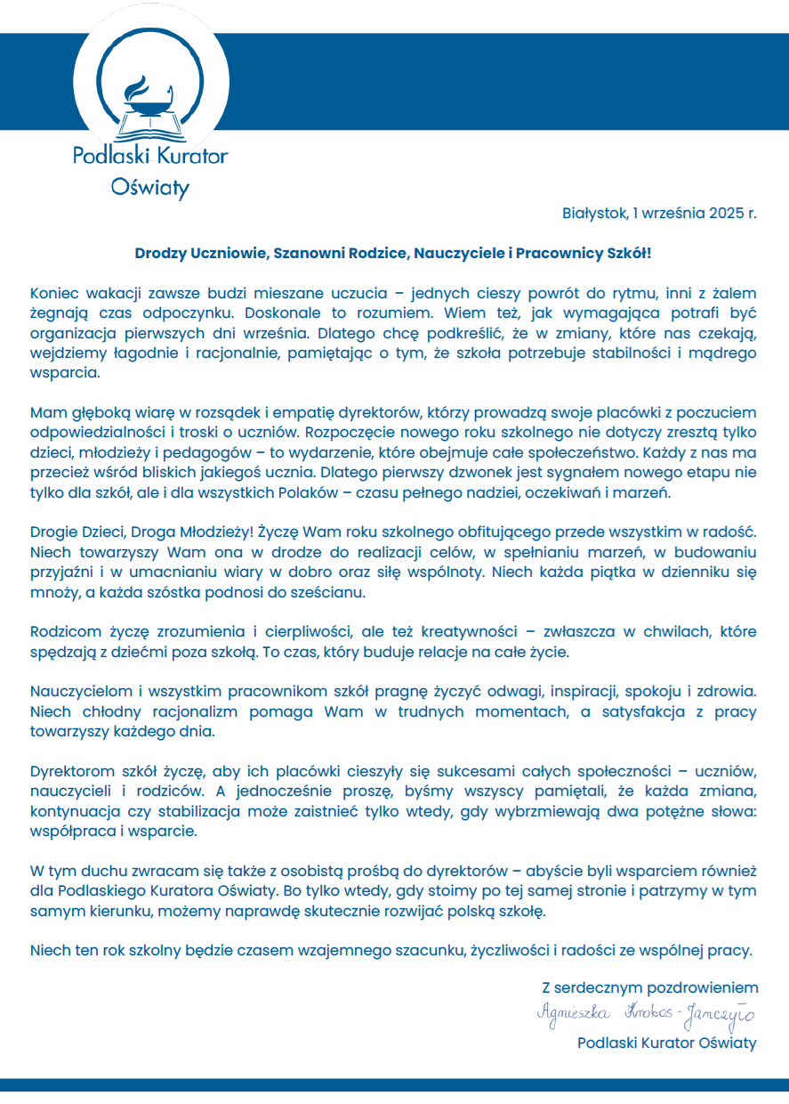 "To wyjątkowy moment – nowy etap, nowe możliwości. Wierzę, że to będzie dla Was czas nie tylko nauki, ale też odkrywania siebie, rozwijania pasji i budowania relacji, które – być może – zostaną z Wami na całe życie.