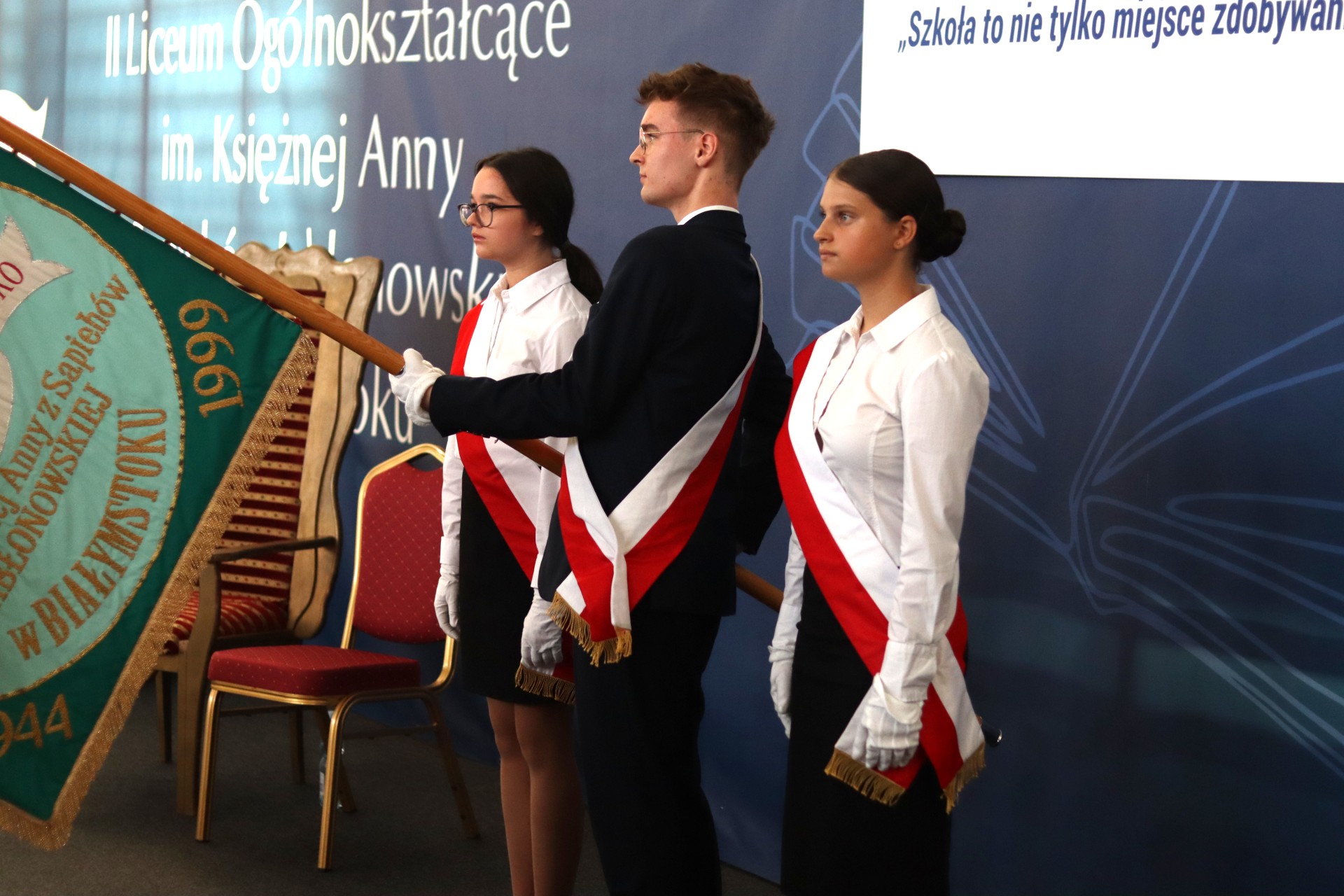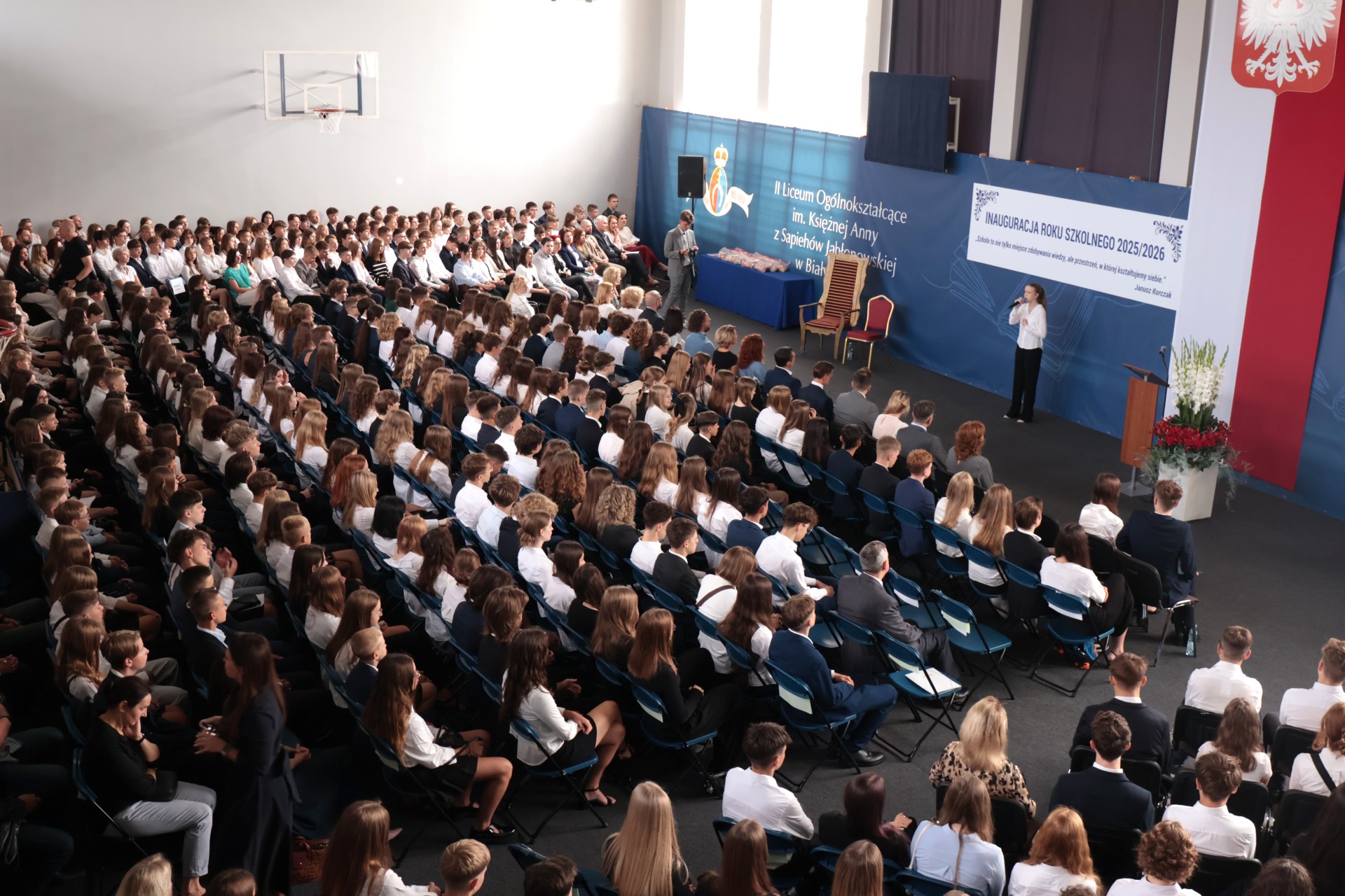 1 września w sali gimnastycznej naszej szkoły odbyła się inauguracja nowego roku szkolnego 2025/2026 dla uczniów II Liceum Ogólnokształcącego im. Księżnej Anny z Sapiehów Jabłonowskiej w Białymstoku i Szkoły Podstawowej nr 53 z Oddziałami Dwujęzycznymi w Białymstoku. Zgromadzoną młodzież, przedstawicieli rodziców i nauczycieli oraz gości przywitał dyrektor szkoły Pan Dariusz Bossowski.