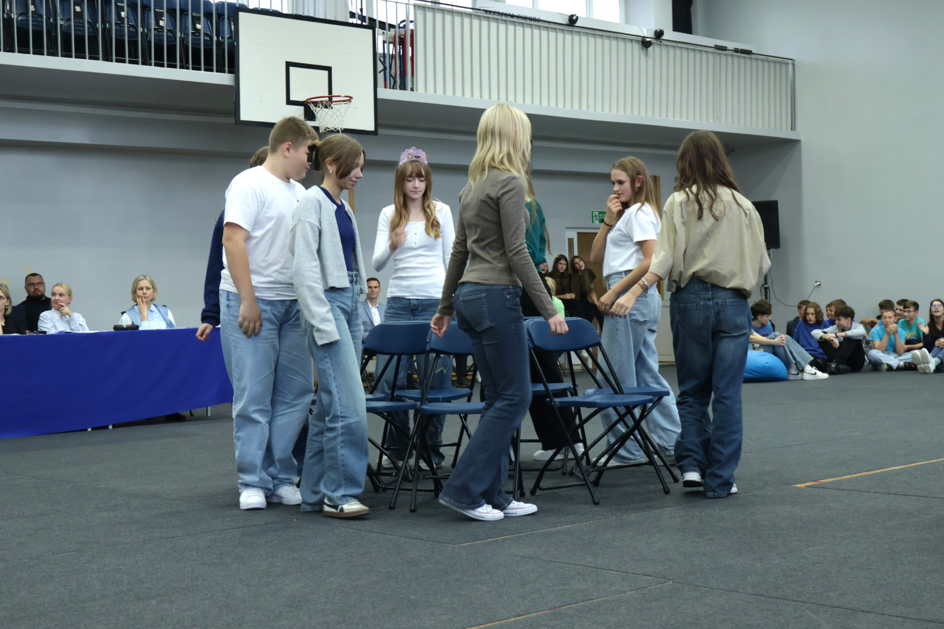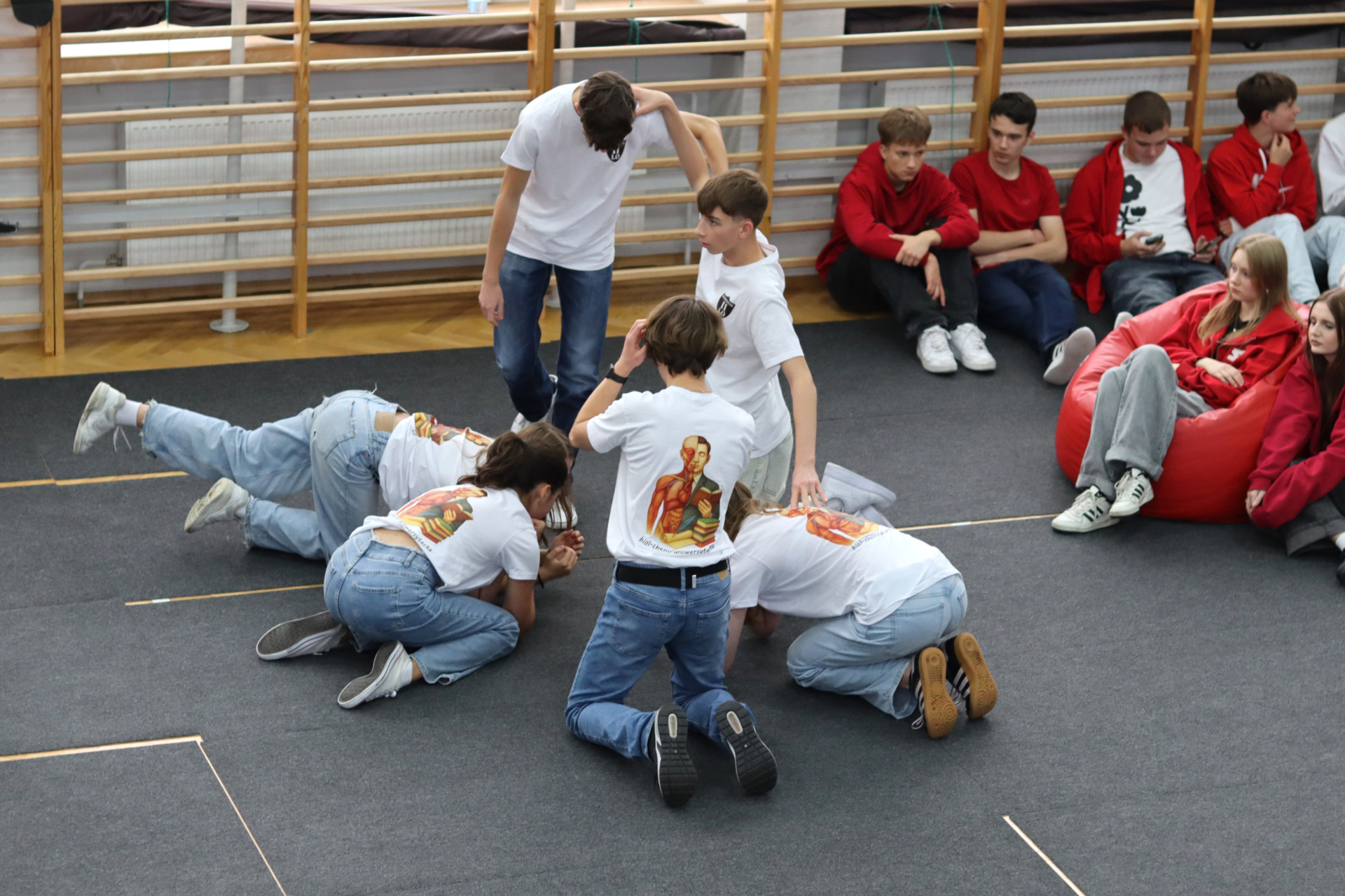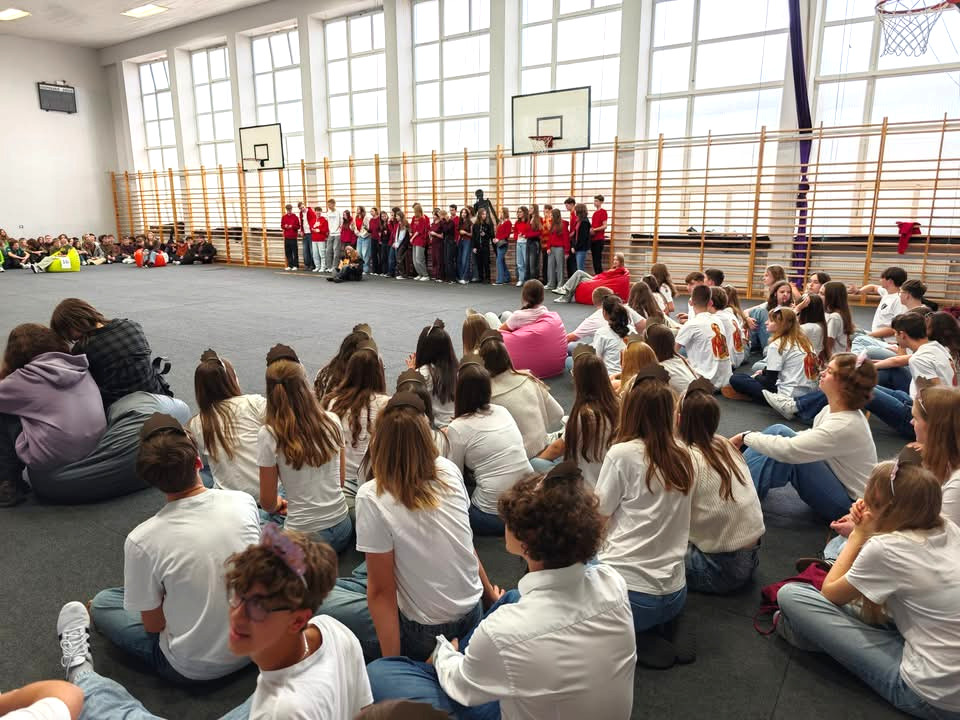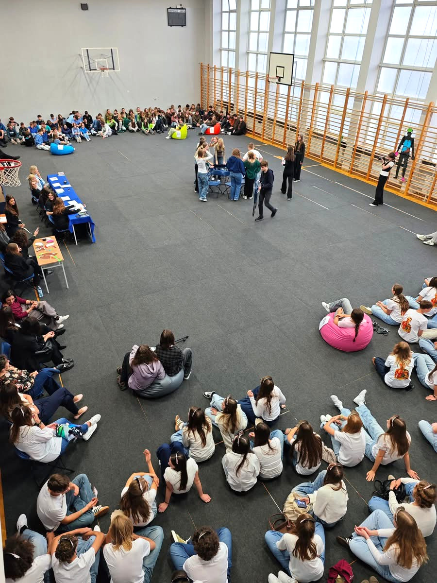 Impreza rozpoczęła się od prezentacji każdej z pierwszych klas – uczniowie wykazali się pomysłowością, kreatywnością i poczuciem humoru, przedstawiając swoje klasy w oryginalny sposób. Następnie przyszedł czas na różnorodne konkurencje: zwinnościowe, muzyczne oraz sprawdzające wiedzę ogólną. Wszystkie klasy dały z siebie wszystko, a atmosfera zdrowej rywalizacji udzieliła się zarówno uczestnikom, jak i wychowawcom. Na zakończenie wszyscy uczniowie wspólnie zatańczyli belgijkę, co było doskonałym zwieńczeniem całej imprezy i symbolem integracji między klasami.
