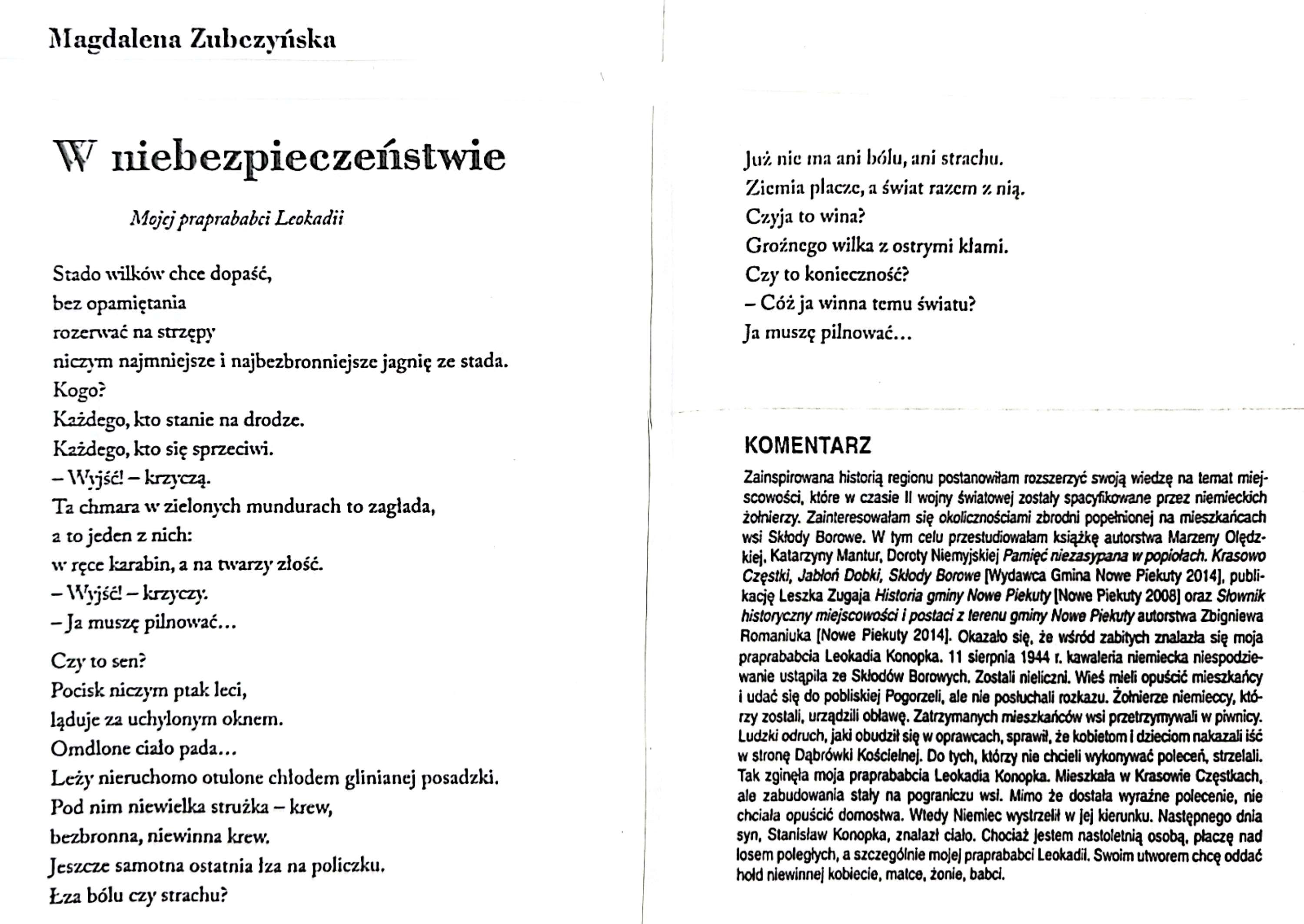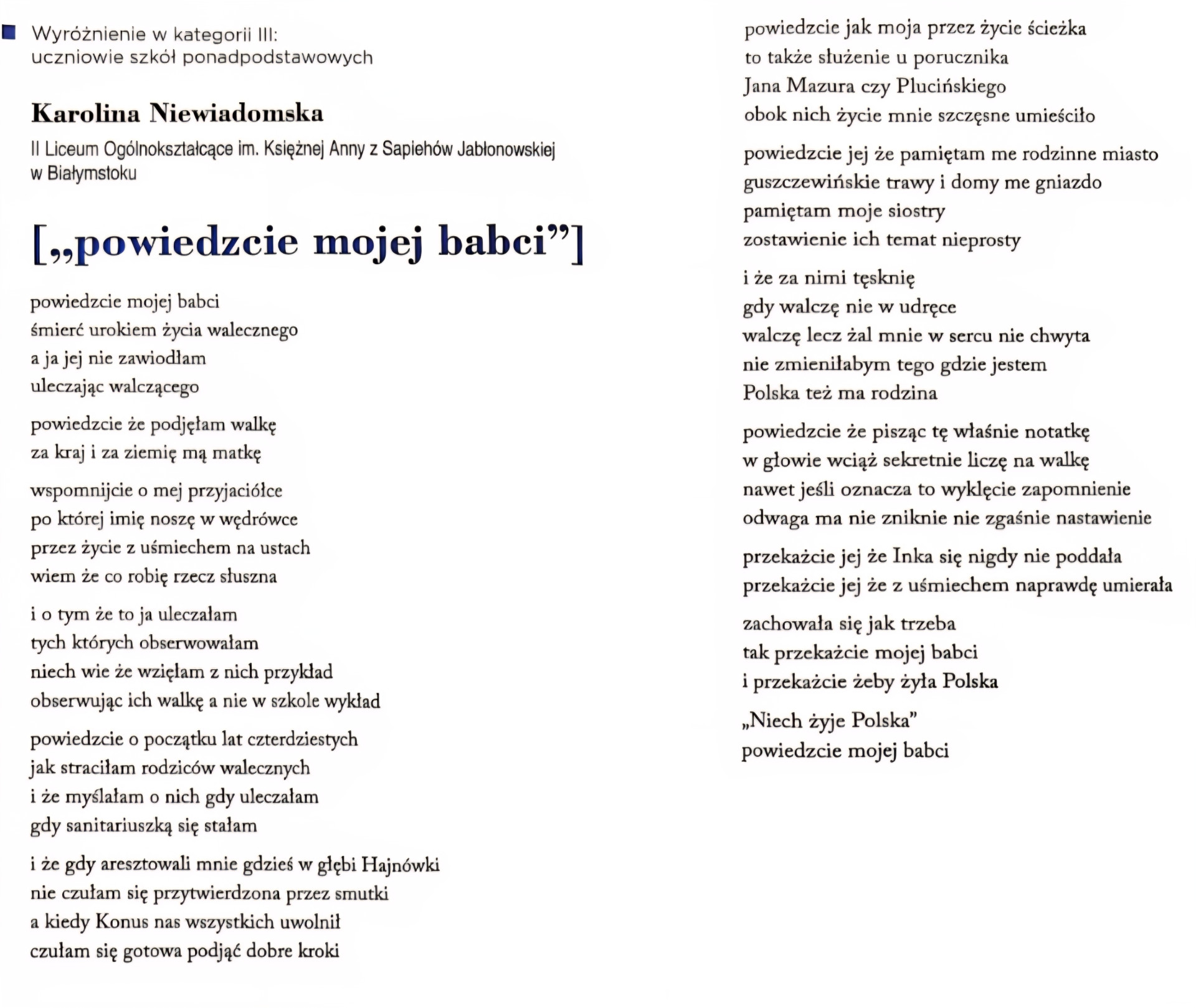 - Karolinę Niewiadomską (klasa 2 d), za utwór [„powiedzcie mojej babci”],;